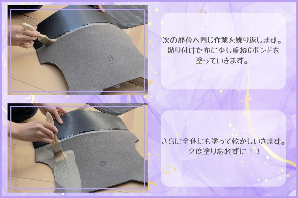 このつなぎ目をできるだけ綺麗に仕上げるポイントは、Gボンドを塗布する際に、すでに貼り付けてある布へ 2〜3mm 程度重ねて貼り付けること。