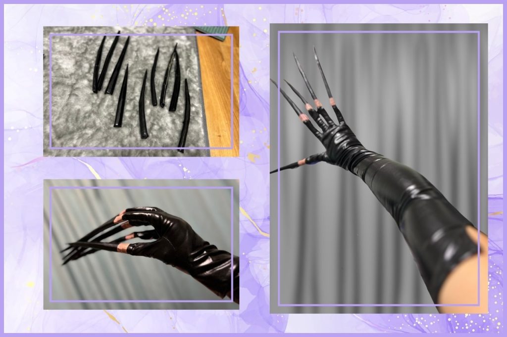 各パーツの完成後、手袋先端に穴を開け、Gボンドを使用して手袋と作った爪を合体させています。