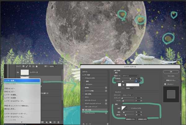 - 【蛍】:ランダムに描けるペンタイプで乱雑に配置していき、”レイヤー効果”より光沢を調整していきます。