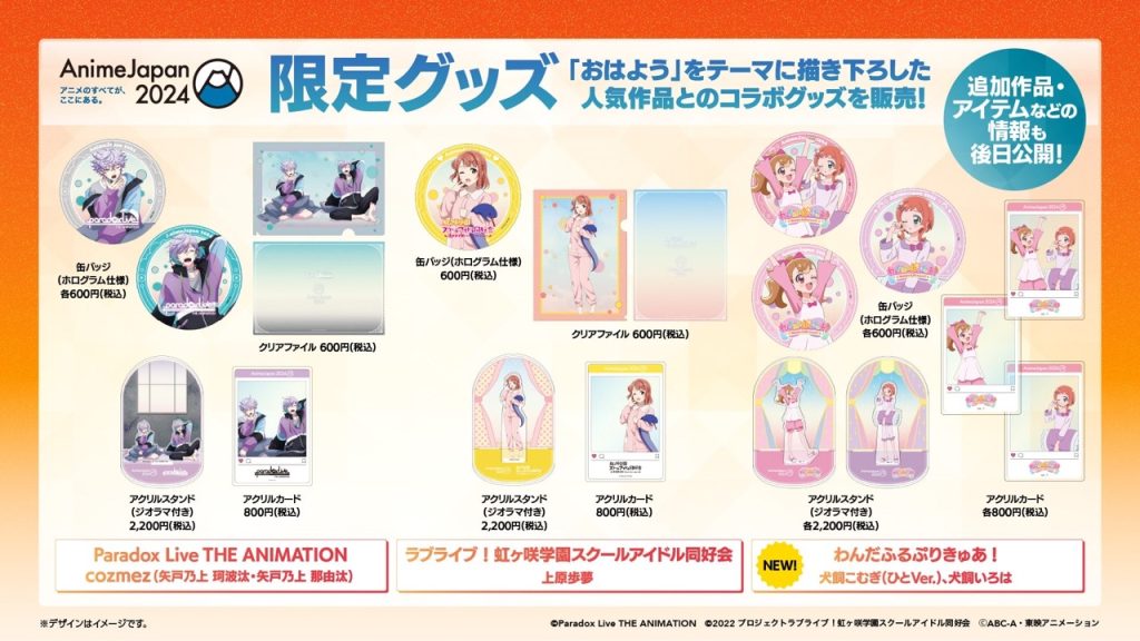 毎年人気を博しているキービジュアルのイラストを使用したオフィシャルグッズや恒例のAJガチャ(缶バッジ)のほか、「おはよう」をテーマにしたAJ限定グッズの第2弾を発表!先日発表された「Paradox Live THE ANIMATION」(cozmez)、「ラブライブ!虹ヶ咲学園スクールアイドル同好会」(上原歩夢​)に加え、「わんだふるぷりきゅあ!」(犬飼こむぎ(ひとVer.)、犬飼いろは)の描き下ろしイラストを使用したアイテムの販売が決定。清々しい朝の目覚めを感じさせるグッズが登場します。
