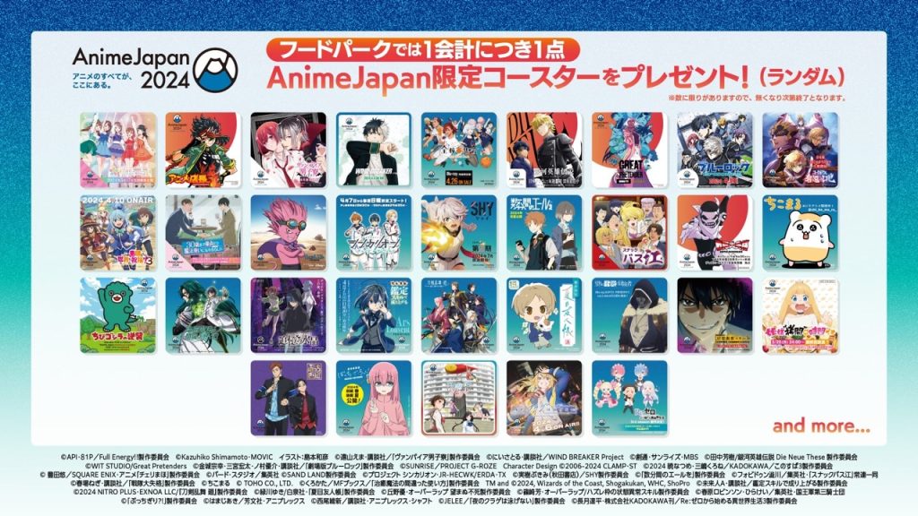 さらにフード購入者には、各店舗1会計につき1点、AnimeJapan限定コースターをランダムでプレゼント!人気作から注目の最新作まで30作品以上が参加した、ここでしか手に入らない特製デザインに!