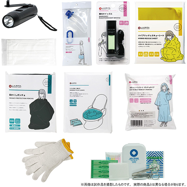 いざという時に備えておきたい「防災セット」が登場!ウォーターバッグやダイナモライトなどの必須アイテムに加え、オリジナルデザインの非常持ち出しリュック、缶バッジやタオルが入った13点セットです。