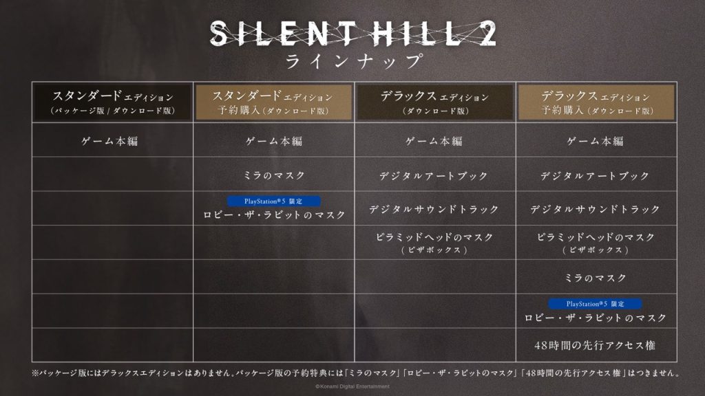 株式会社コナミデジタルエンタテインメントは、『SILENT HILL 2』(PlayStation®5、Steam®)の発売日が2024年10月8日(火)に決定し、本日からパッケージ版とデジタル版の予約を開始したことをお知らせします。