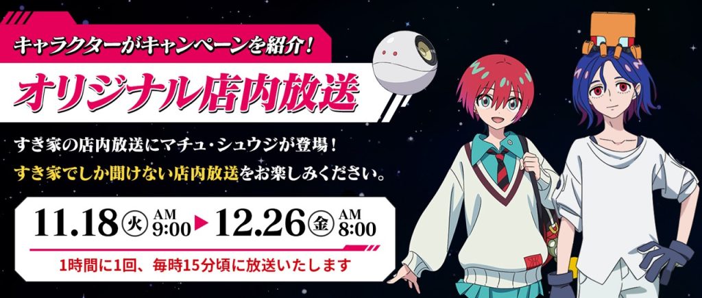 キャンペーン期間中、店舗にてキャラクターたちによる店内放送を聞くことができます。マチュとシュウジがキャンペーンの内容をご紹介します。この機会に、すき家でしか聞くことができない録り下ろしボイスによるオリジナル店内放送をぜひお楽しみください。