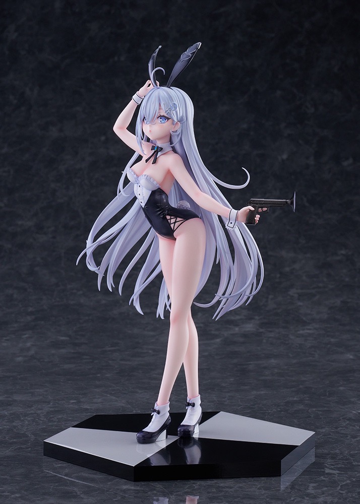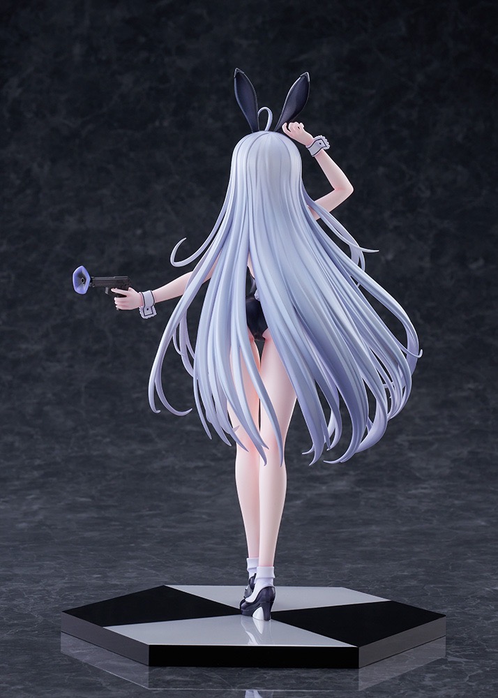 このフィギュアのために描き下ろされたイラストをもとに、バニー耳を気にしてそっとつまみ、ほんのりと頬を染めながらこちらを見つめる青い瞳や