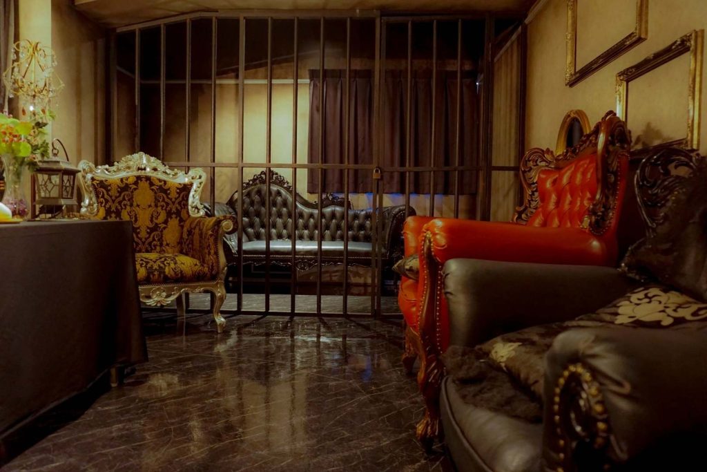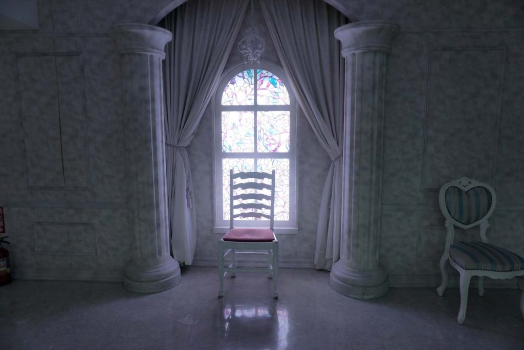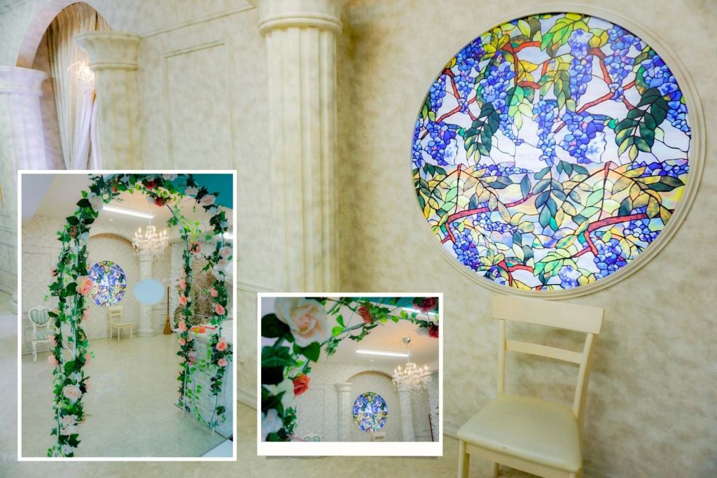 ブース全体が大理石のような高級感でステンドグラスとシャンデリアが引き立ち、